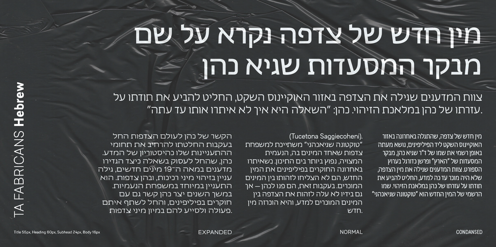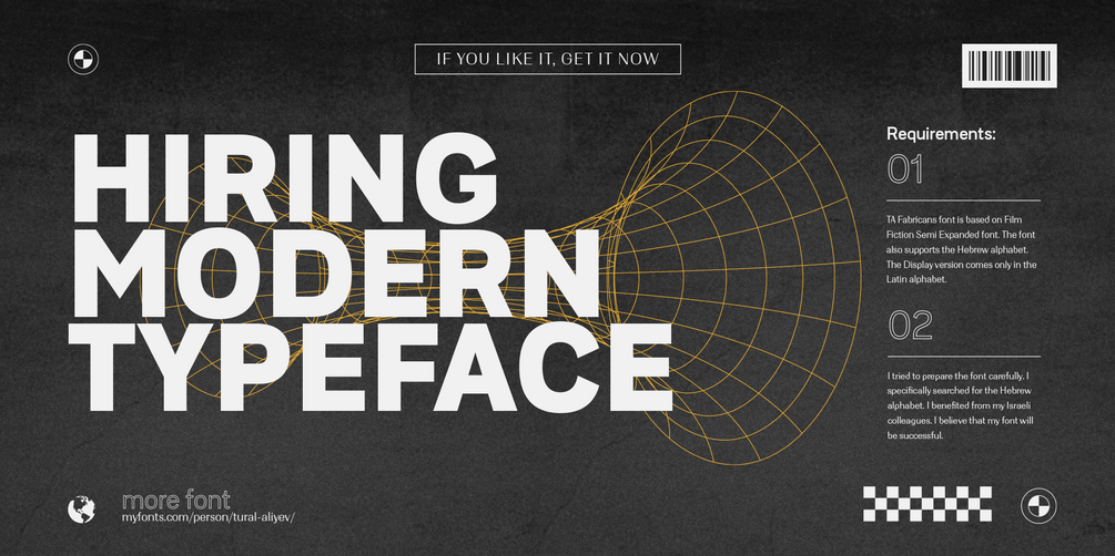 TA Fabricans font is based on Film Fiction Semi Expanded font. The font also supports the Hebrew alphabet. The Display version comes only in the Latin alphabet. I tried to prepare the font carefully. I specifically searched for the Hebrew alphabet. I benefited from my Israeli colleagues. I believe that my font will be successful. Please check and if you have any additional requests or complaints, please write to me. t@taft.work