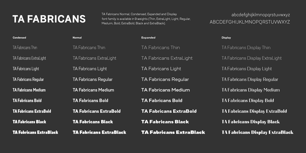 TA Fabricans works great for branding, magazines, headers, logos, TV, UI, web, badge, packaging, headlines, posters, t-shirt/apparel etc. TA Fabricans offers you options to explore a whole host of applications and gives a real modern feel to any project.