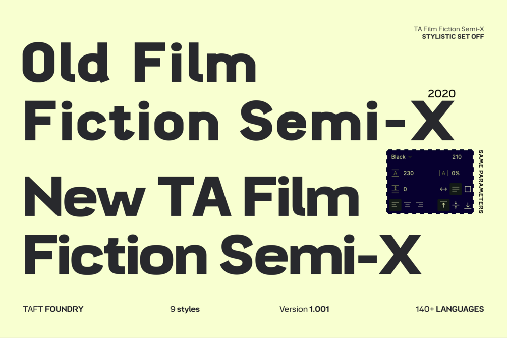 Film Fiction Semi Expanded has been updated and will now beautify your designs under the name TA Film Fiction Semi-X. We've already updated and revitalized TA Film Fiction Semi-X to ensure it perfectly matches your evolving creative vision. The inclusion of tabular figures, old-style figures and alternative glyphs expands your design palette and allows you to adapt the font to your unique style. TA Film Fiction Semi-X has been updated experience the appeal – this can be your font of choice to enhance your brand identity, cinematic efforts and editorial design. This brilliant typeface is not just a typographic tool, but a creative catalyst for headlines, logos, web elements, signage, posters and fashion apparel, packaging. TA Film Fiction Semi-X does not follow trends, it defines them, imbuing each project with a true modern essence.
