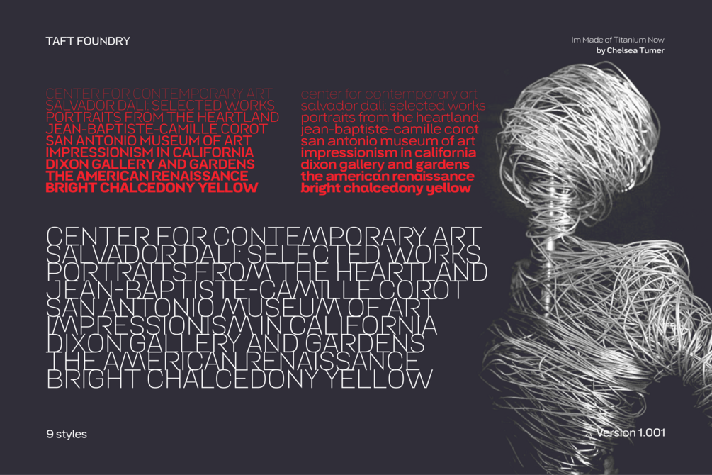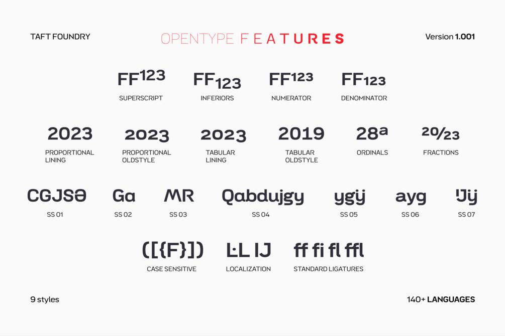 Embrace the possibilities with 9 different styles, each boasting a large set of 758 glyphs. Discover OpenType features: Access All Alternates, Case-Sensitive Forms, Glyph Composition / Decomposition, Denominators, Fractions, Kerning, Standard Ligatures, Lining Figures, Localized Forms, Mark Positioning, Mark to Mark Positioning, Numerators, Oldstyle Figures, Ordinals, Proportional Figures, Stylistic Alternates, Scientific Inferiors, Stylistic Set 1, Stylistic Set 2, Stylistic Set 3, Stylistic Set 4, Stylistic Set 5, Stylistic Set 6, Stylistic Set 7, Subscript, Superscript, Tabular Figures