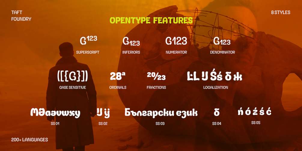 TA Gosling is a font dedicated to the creativity and unique style of Ryan Gosling. This font, which combines retro and vintage charm with bold and legible design, pays tribute to Ryan Gosling's cinematic legacy. Created by Taft Foundry, this distinctive font is designed to attract attention and evoke a sense of nostalgia, making it ideal for various creative applications. Ryan Gosling's diverse and impactful roles, his powerful performances in films, and the complex characters he portrays are reflected in the aesthetic and functional features of this font. TA Gosling font comes in 8 styles, offering users a wider range of options for different projects.