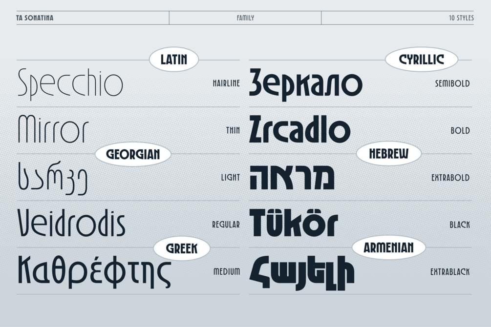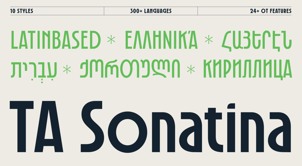 The standout feature of TA Sonatina lies in its blend of structured geometry and fluid curves, offering a perfect balance of sharp edges and soft contours. Its multilingual support includes Latin, Cyrillic, Armenian, Greek, Hebrew, and Georgian scripts, celebrating typographic diversity with seamless integration.