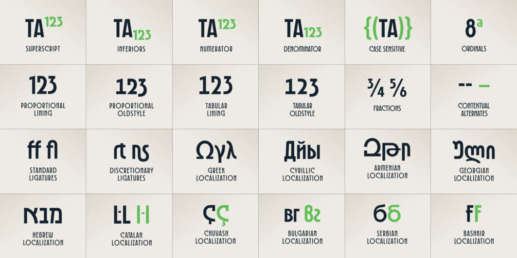The typeface includes an extensive set of OpenType features to elevate creative possibilities. These features include Discretionary Ligatures, Standard Ligatures, and a rich selection of Stylistic Alternates (SS01 to SS14), enabling unique letter variations such as alternative Cyrillic, Georgian, and Latin forms. Additional typographic enhancements include Tabular Figures, Fractions, Superscripts, Subscripts, and Localized Forms, ensuring flexibility across diverse languages and design needs.
