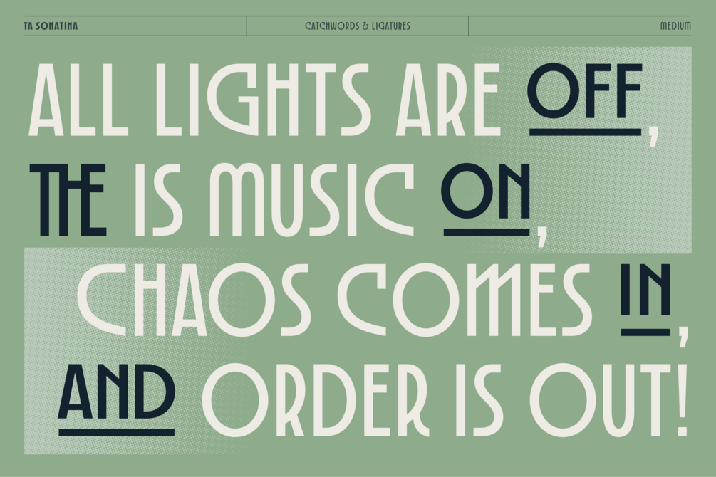 Whether you’re designing a book cover, logo, or avant-garde visual piece, TA Sonatina offers a typographic melody that sings with character and elegance.